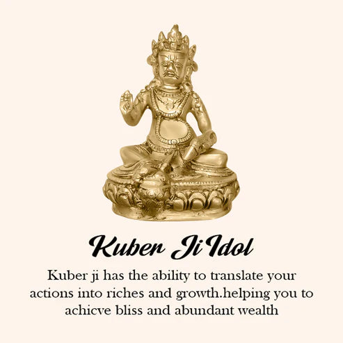 Bring home the blessings of Lord Kuber Ji, the eternal God of Wealth and Riches, with this beautifully crafted golden idol. Lord Kuber is revered as the guardian of prosperity and is worshipped to attract financial stability, abundance, and success. This idol, with its fine detailing and golden finish, is not only auspicious but also enhances the beauty of your sacred space.