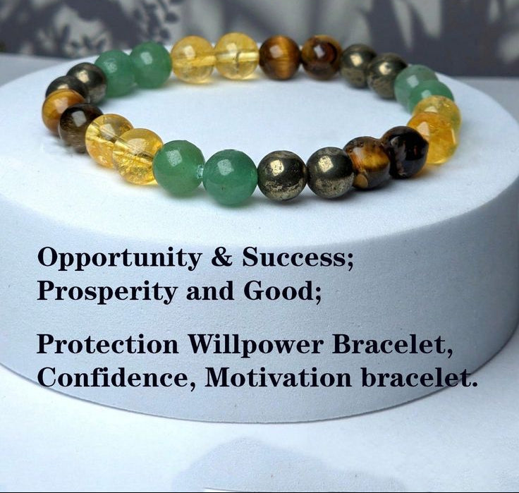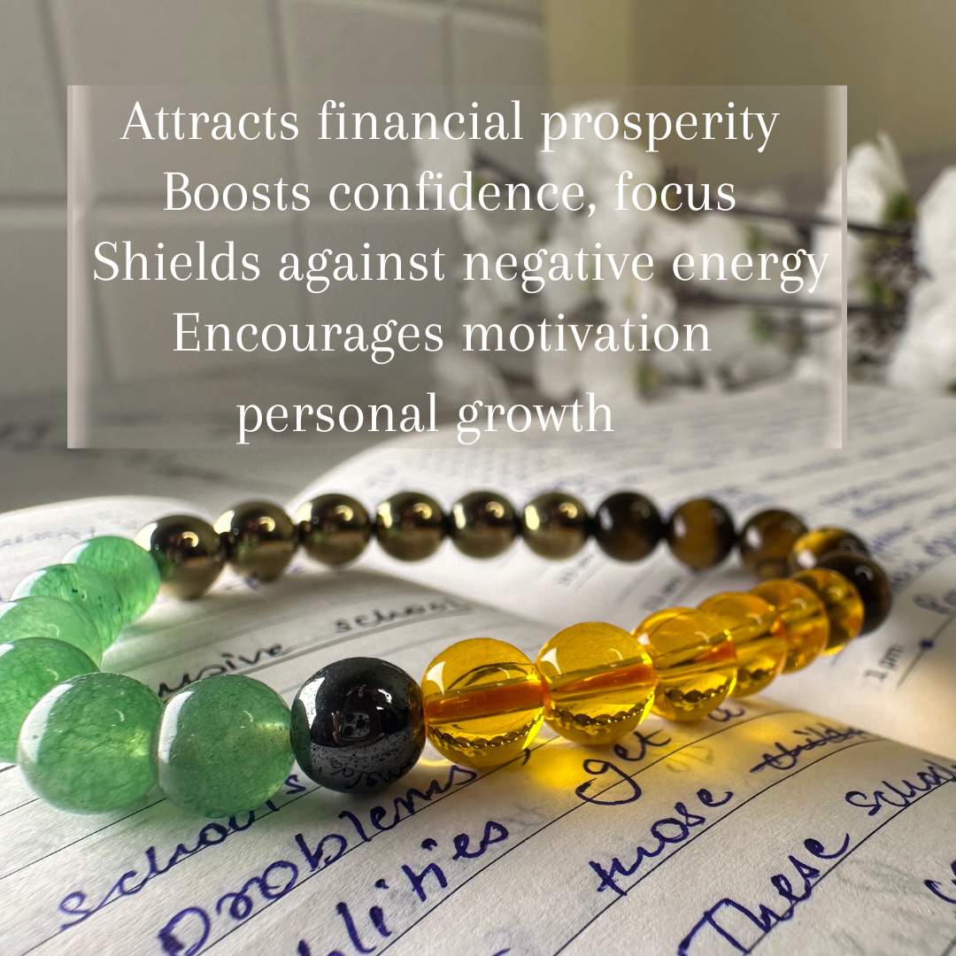 A powerful combo of four energy-rich stones in one stylish bracelet. Citrine for positivity, Aventurine for luck, Tiger’s Eye for confidence, and Pyrite for wealth protection. This bracelet supports clarity, growth, and abundance — perfect for everyday wear with purpose.
