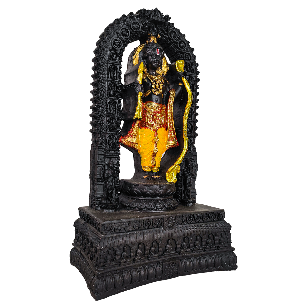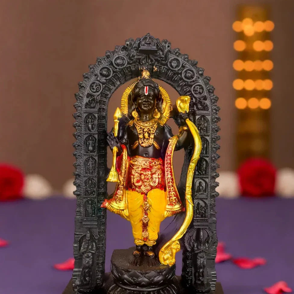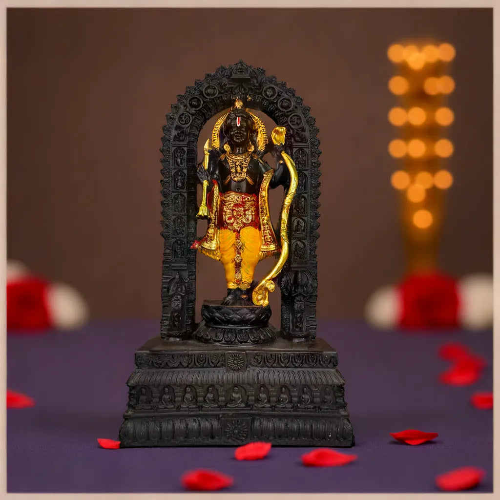- Handcrafted Excellence: This Ram Lala Ji sculpture combines traditional artistry with contemporary elegance, featuring a luxurious black and golden finish with an antique touch.