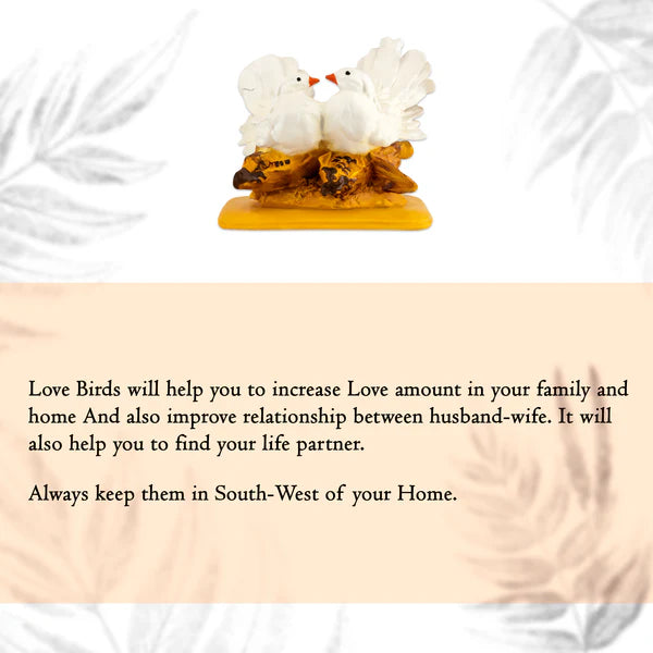 Strengthen love, bonding, and emotional harmony with this beautiful Love Bird Showpiece, a powerful Vastu remedy for relationships. Love birds symbolize togetherness, trust, romance, and long-lasting companionship, making this décor piece ideal for couples and families.