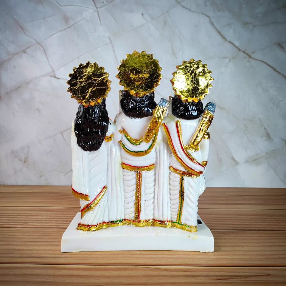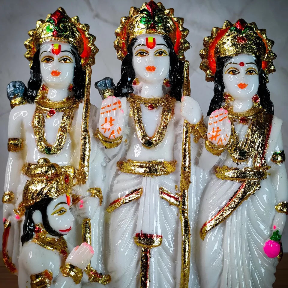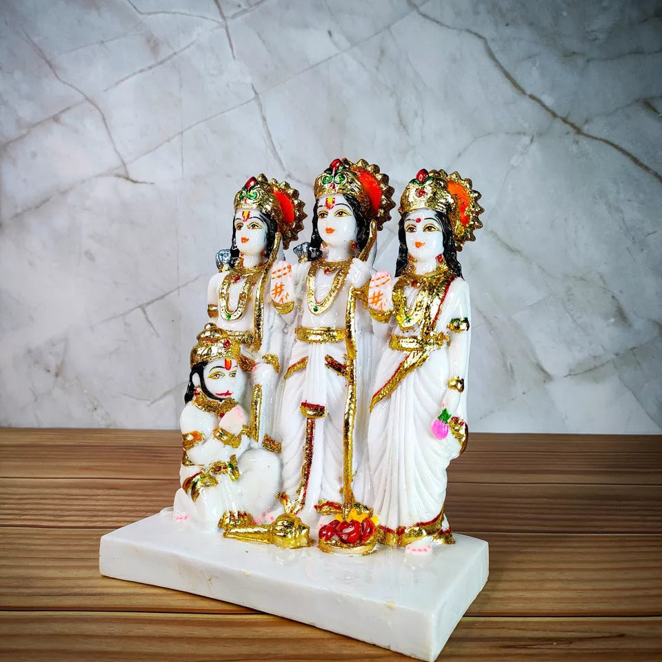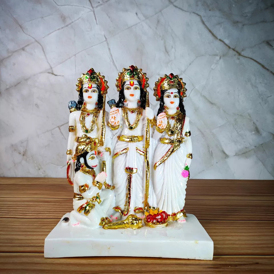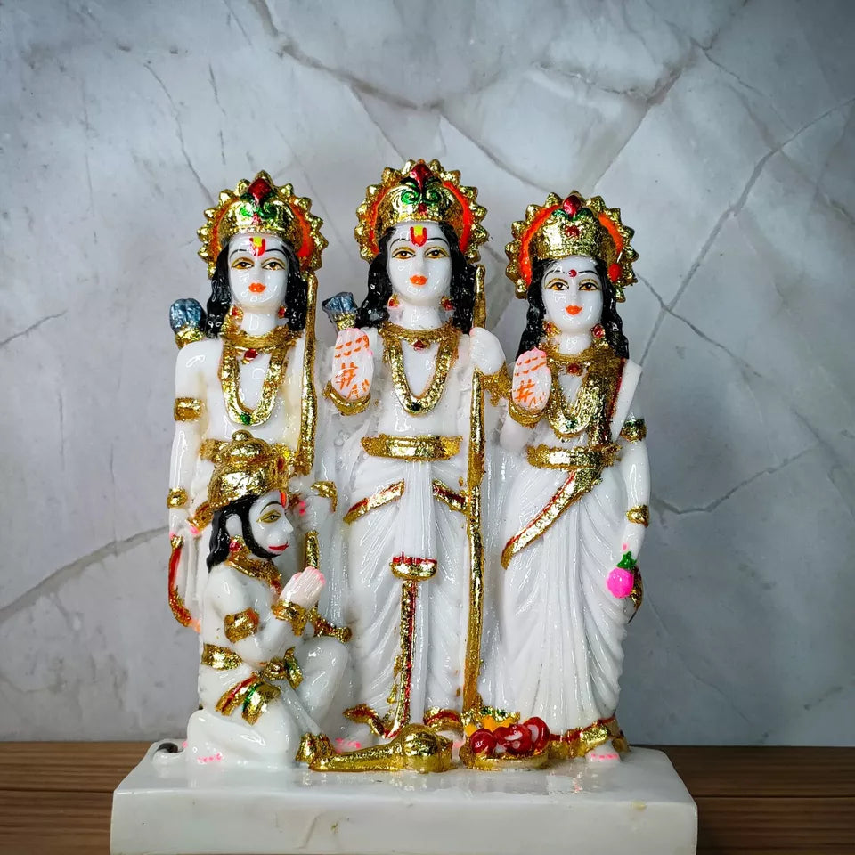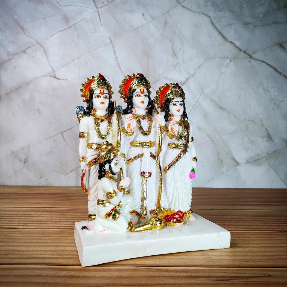 The Ram Darbar idol includes Lord Rama, his wife Goddess Sita, his younger brother Lord Lakshman, and his dedicated devotee Lord Hanuman. Lord Rama is the seventh incarnation (Avatar) of Lord Vishnu who is known as a great king and Sita is his perpetual consort and an incarnation of Goddess Lakshmi. Lord Rama, an ideal man and hero of the epic Ramayana, symbolizes the good manners and virtue. Built using cultured marble and finished with rich colors, this idol will sit well with most home decor themes and mandir finishes.