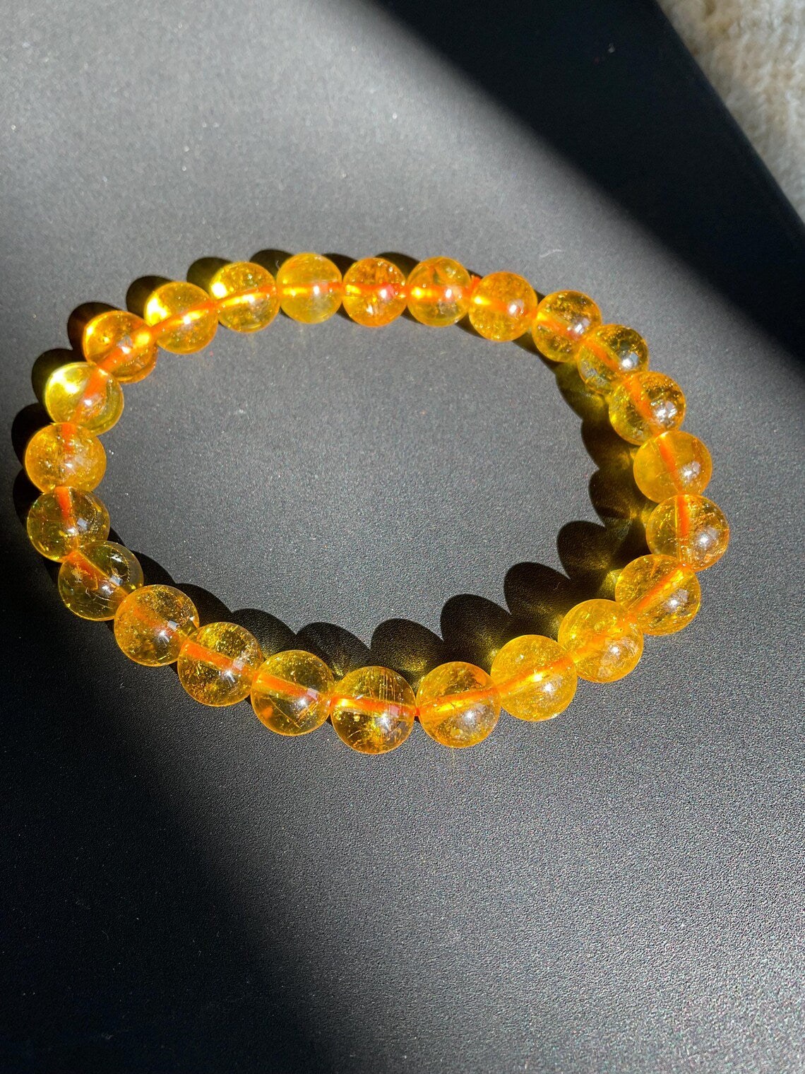 Crafted with 8mm polished citrine beads, this bracelet activates the Solar Plexus Chakra, promoting confidence, clarity, and inner strength. Its vibrant yellow hue adds a touch of warmth to any outfit, making it perfect for everyday wear or special occasions.